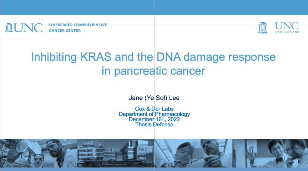 Jane Ye Sol Lee successfully defended her doctoral thesis on December 16th, 2022. Jane’s research was on Inhibiting KRAS and the DNA damage response in pancreatic cancer. The Der, Cox, and Bryant labs, along with friends and family of the new Dr. Jane Lee, will meet at 3:00 for food and celebration.